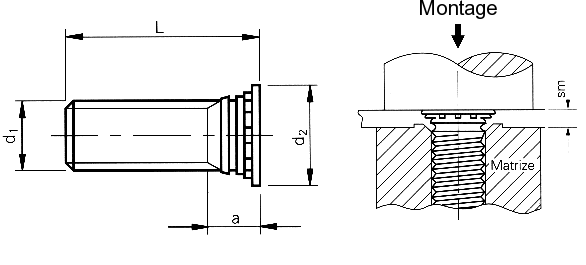 Flush head studs for through-holes not requiring additional deburring or welding. Available in different lengths. Specially suitable for VA sheets and other sheet metals.