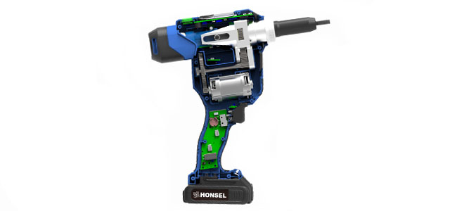 With the new HONSEL battery riveter, the industrial series manufacturing requirements aligned ultimate solution for battery-powered processing of blind rivet nuts and screws are available. Geared to the requirements of industrial series production, Rivdom offers eVNG 2 a variety of useful features and options